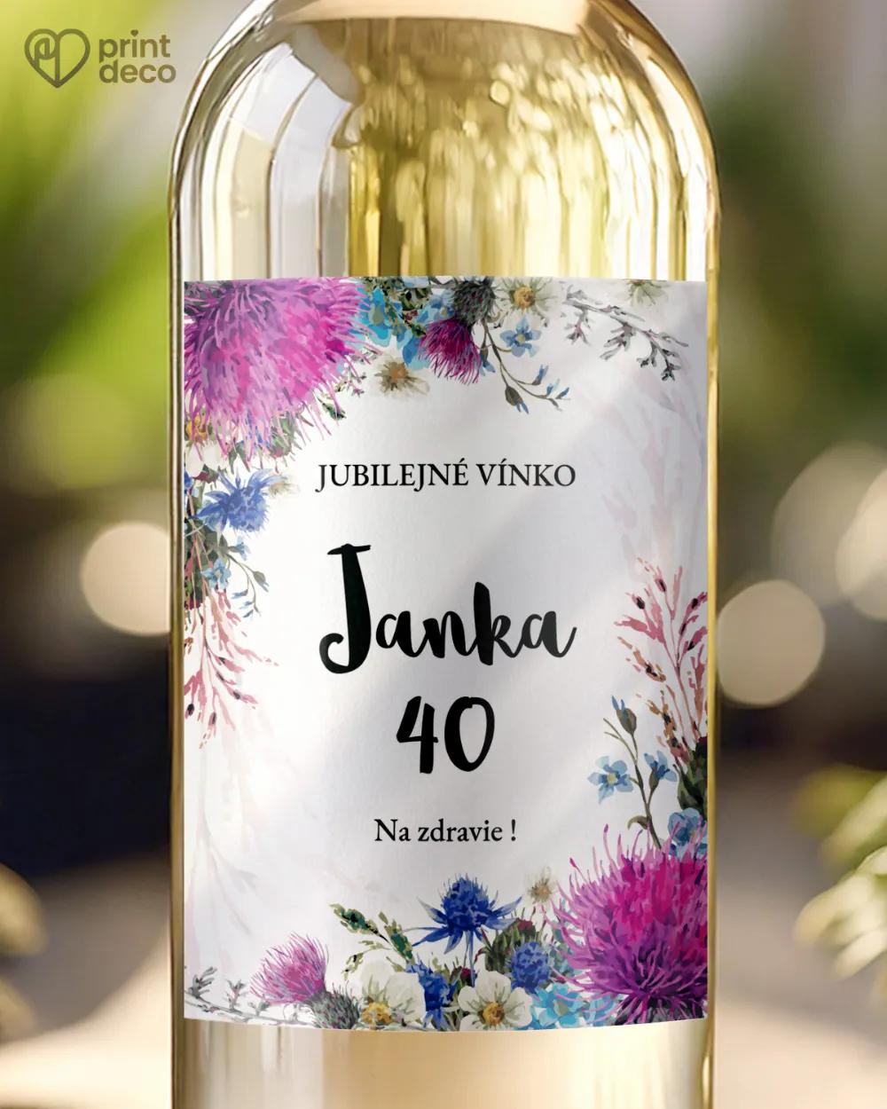 Personalizovaná etiketa na víno s kvetinovým motívom – vhodná na výzdobu aj výslužkové fľaše k oslave jubilea.