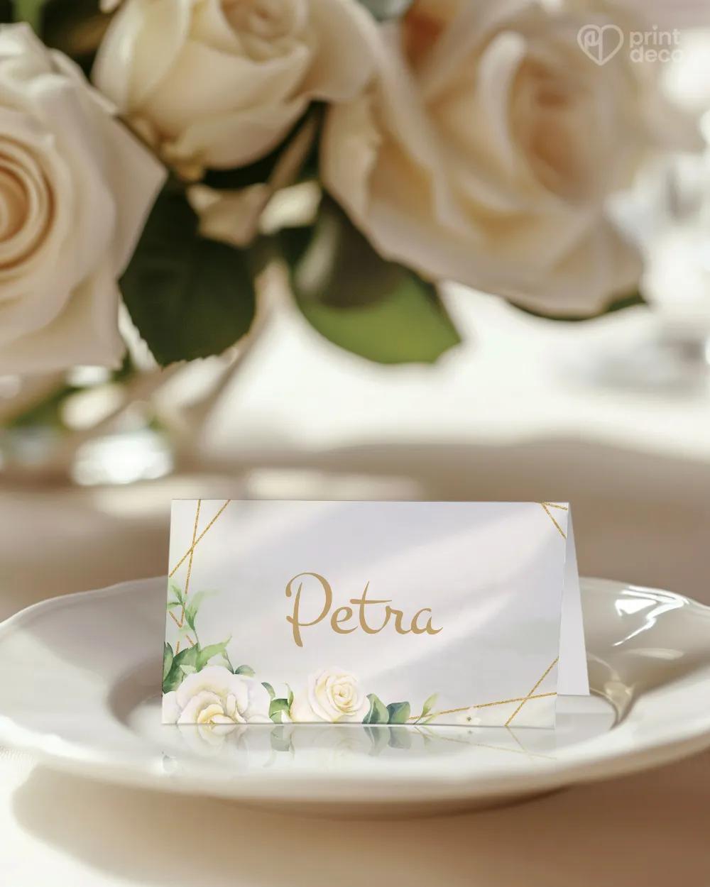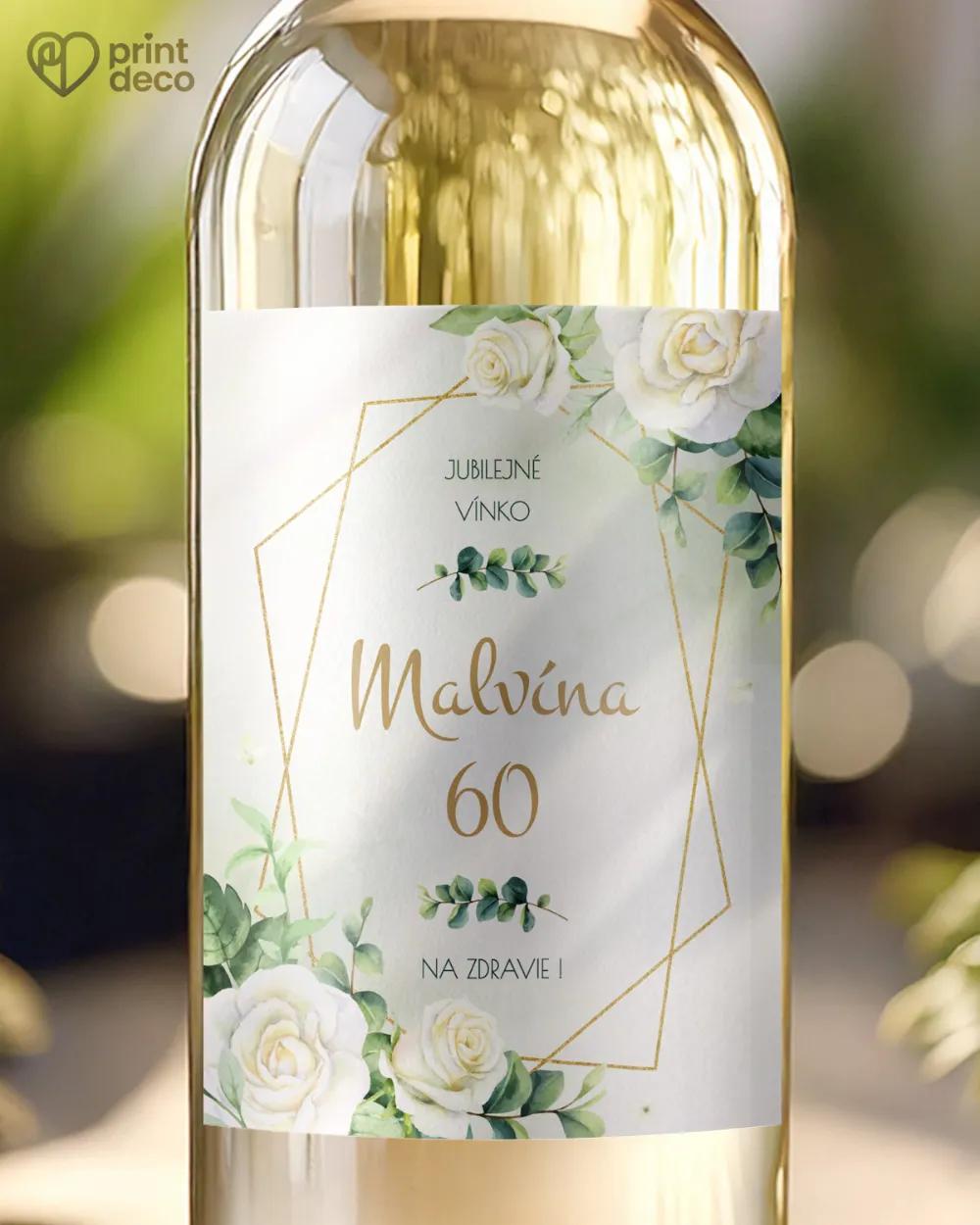 Vznešená a vkusná pozvánka na oslavu narodenín je tvorená bielym pozadím, fotkou oslávenca dozdobenou zlatými čiarami a celá pozvánka je dozdobená bielymi ružami a zelenými listmi. V rovnakom motíve si viete u nás vybrať i menovky či etikety na fľaše, aby bolo všetko dokonale zladené.