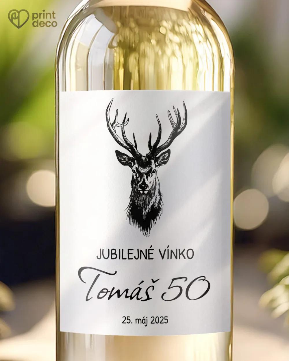 Minimalistické poľovnícke menovky na oslavu s kresbou jeleňa – elegantný čiernobiely dizajn pre štýlové jubileum.