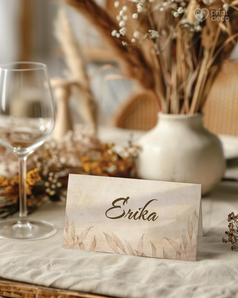 Svetlá rustikálna menovka na stôl je ideálnym doplnkom na oslavu jubilea, kde dominuje prírodná výzdoba. Imitácia svetlého dreva pôsobí čisto, sviežo a štýlovo zároveň. Nadčasový dizajn je vhodný pre oslavy v exteriéri, altánkoch, sálach s dreveným obkladom či vo vínnych pivniciach.