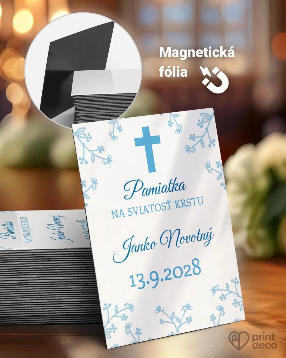 Jemnú a decentnú pozvánku na sviatosti v modrej alebo ružovej farbe dotvárajú drobné kvietky, symbol krížika a doplnená je ozdobou vo forme mašličky. Túto pozvánku môžete využiť na krst, ale i sviatosti ako prvé sväté prijímanie, birmovku či konfirmáciu. Následné stretnutie či posedenie s rodinou môže byť tiež ladené do modrej či ružovej a u nás si v týchto motívoch môžete zajednať i etikety na fľaše alebo pamätné magnetky.