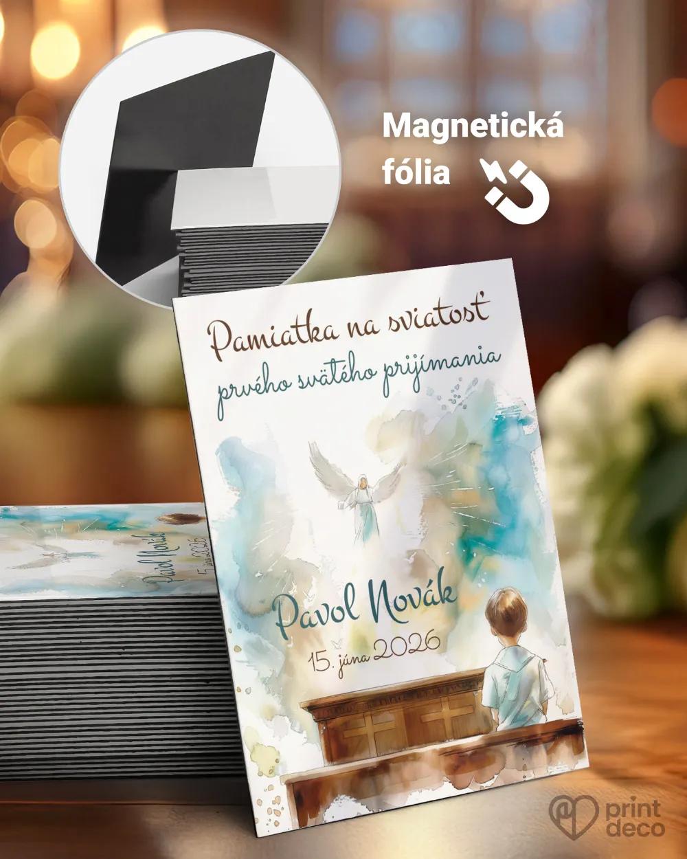 Zaujímavá, ale stále vkusná pozvánka pozýva na sviatosti ako krst, prvé sväté prijímanie, birmovku či konfirmáciu. Tvorená je bielo-hnedo-modrým pozadím, na ktorom sa vyníma anjel, pod ktorým sa v laviciach nachádza modliace dievčatko. V týchto odtieňoch sa môže niesť i výzdoba Vášho posedenia k tomuto významnému dňu a doplniť ho môžete napríklad aj etiketami na fľaše či pamätnými magnetkami v rovnakom motíve z našej ponuky.