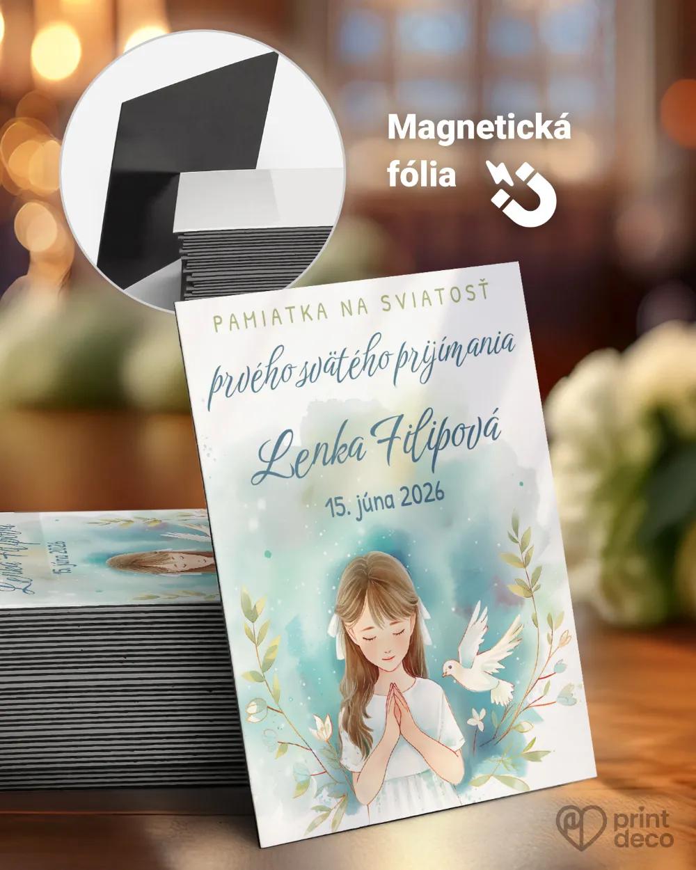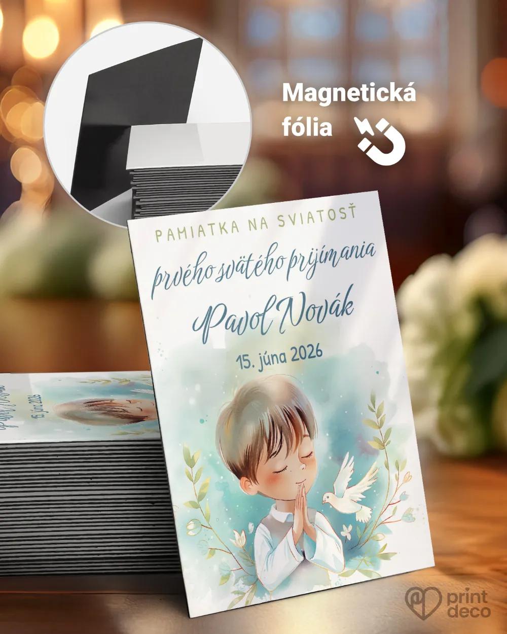 Vkusná a jednoduchá pozvánka na sviatosti, ktorú môžete využiť na krst, prvé sväté prijímanie, birmovku či konfirmáciu. Pozvánka je tvorená jemným modrým pozadím s halúzkami a kvietkami, holubicou a na ňom sa vyníma postava modliaceho sa chlapca. Doplniť ju môžete i ďalšími tlačovinami v rovnakom motíve z našej ponuky, ako napríklad etiketami na fľaše či pamätnými magnetkami a môžete tak mať i hmotnú pamiatku na tento významný deň.