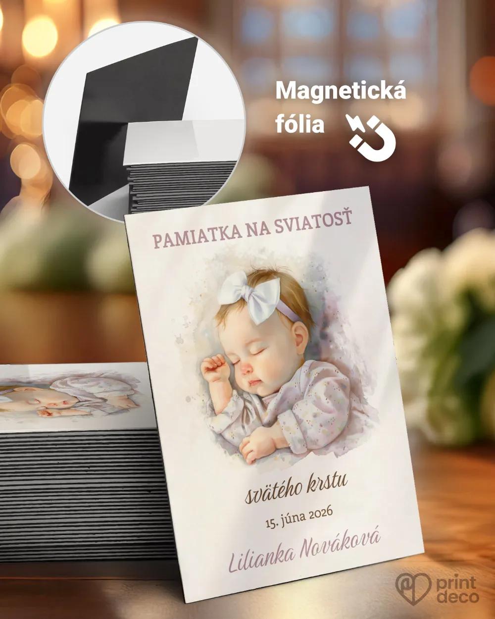 Rozkošná nádherná pozvánka na sviatosť krstu, ktorá všetkých Vašich hostí pozve osláviť tento významný deň spolu s Vami. Hlavným prvkom tejto pozvánky je krásne spiace dievčatko, ktoré je v ružovkovo-fialovom pozadí, ale pôsobí stále veľmi vkusne. S doplnením ďalších tlačovín v rovnakom motíve z našej ponuky, ako napríklad pamätných magnetiek alebo etikiet na fľaše, vytvoríte jeden krásny celok.