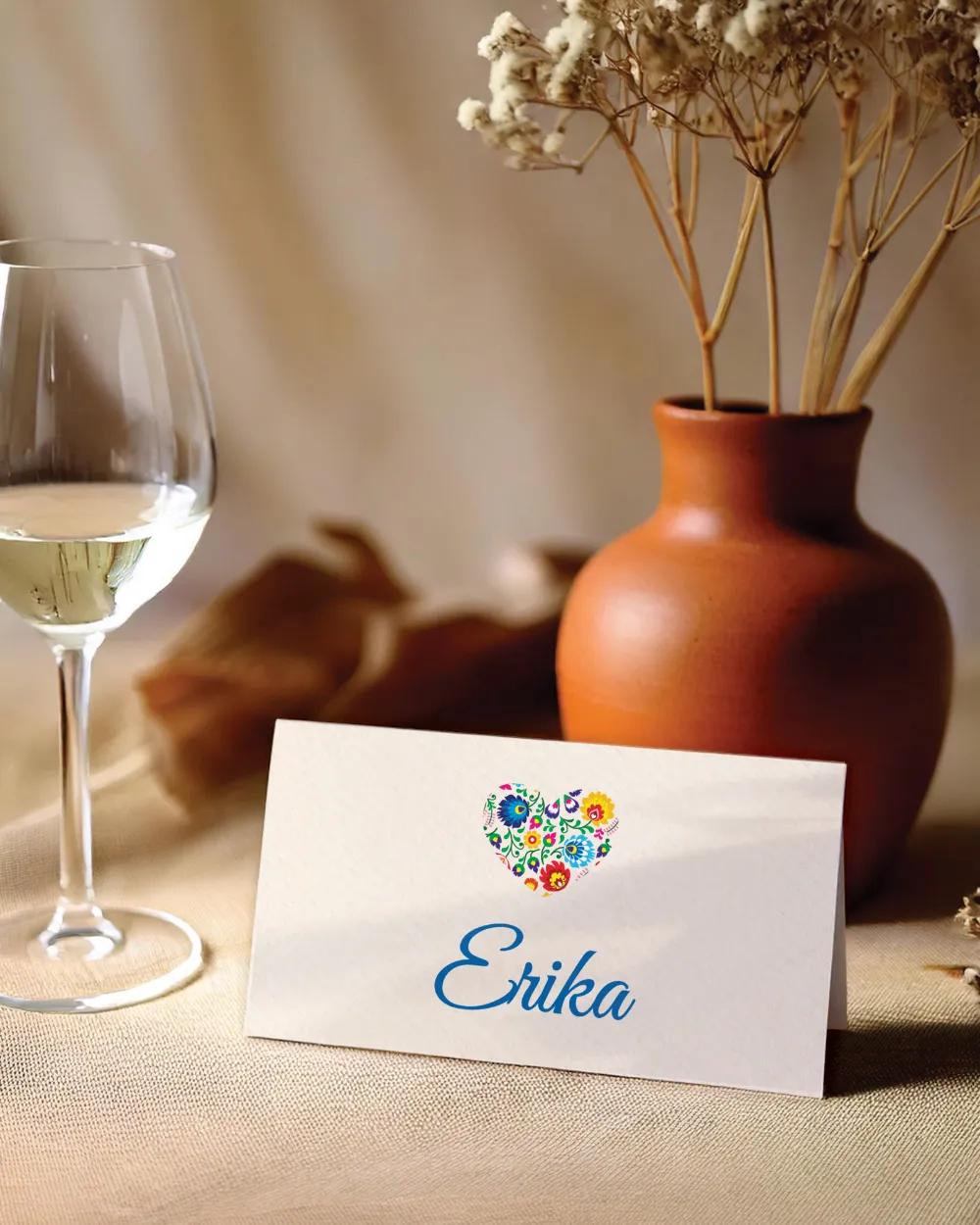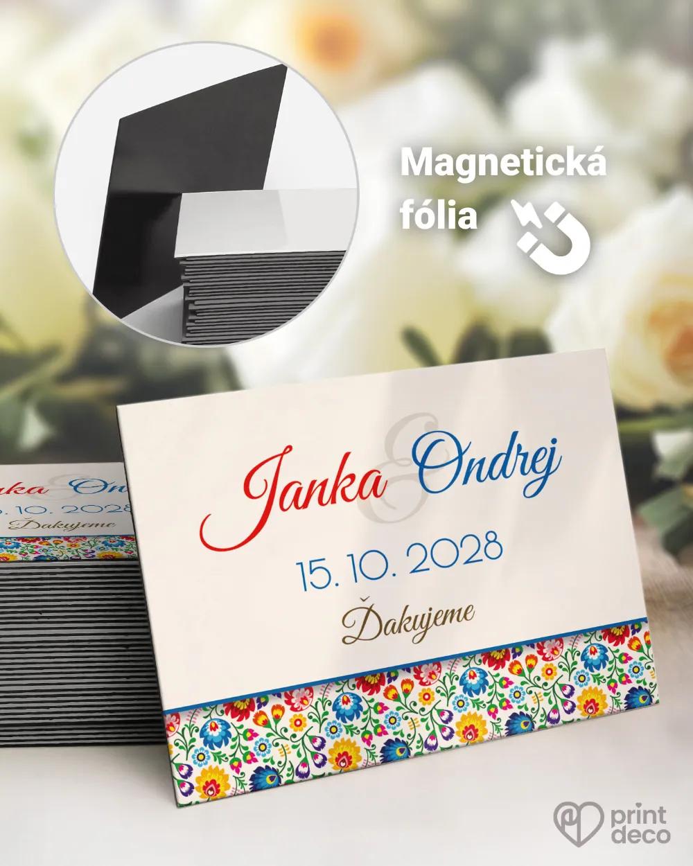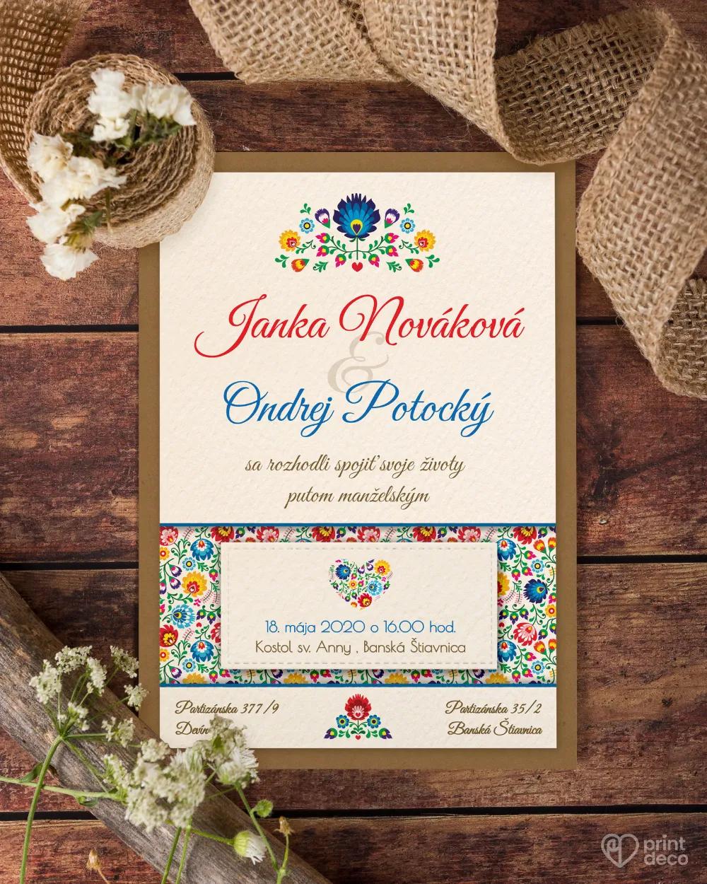 Originálne svadobné samolepky na výslužky s menami, dátumom a farebným ľudovým motívom v tvare srdca ozdobia vaše svadobné darčeky tradične a štýlovo. Bohatý folklórny vzor plný kvetov v červenej, modrej, žltej a zelenej farbe na krémovom podklade pôsobí veselo a autenticky, ideálny pre svadbu s ľudovým alebo rustikálnym nádychom. Samolepky si môžete ľahko personalizovať zdarma cez online editor podľa svojich predstáv. K dispozícii sú v dvoch tvaroch – kruhové aj obdĺžnikové – aby ste si mohli vybrať podľa vkusu. Samolepky navyše zladíte aj s ďalšími svadobnými tlačovinami, ako sú etikety na fľaše, magnetky, menovky, menu a mnoho ďalších doplnkov.