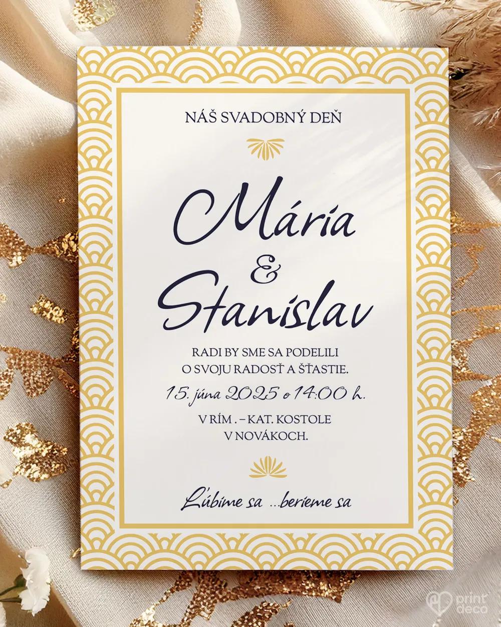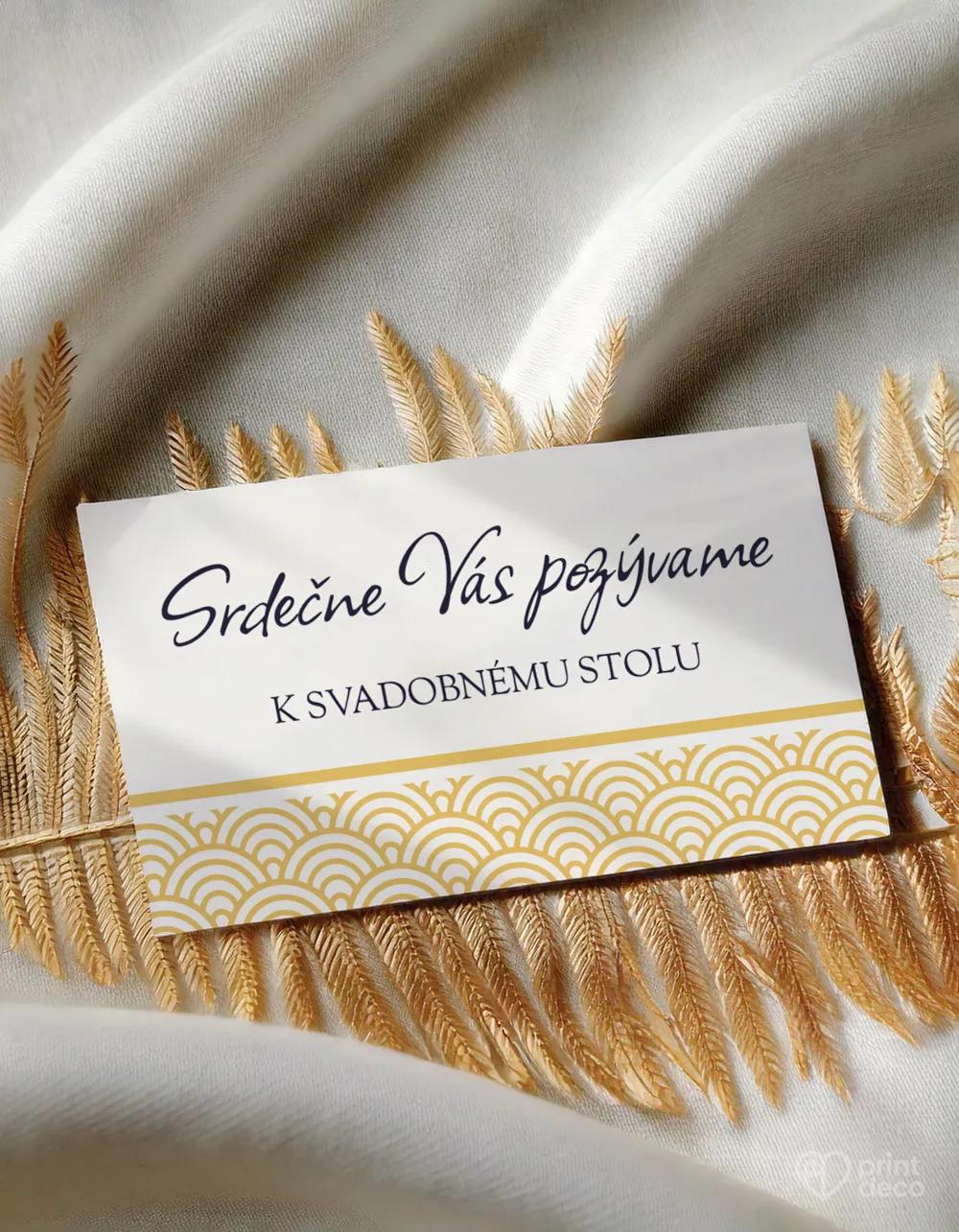Štýlová svadobná magnetka s elegantným art deco motívom zlatých oblúkov a decentným rámom ozdobí váš svadobný stôl noblesou a vkusom. Je krásnou pamiatkou na svadbu a originálnym darčekom pre hostí, ktorí si ju uchovajú ako výnimočnú spomienku. Vďaka personalizácii textu podľa vašich predstáv bude magnetka jedinečná a dokonale prispôsobená vašej výzdobe. Jemný geometrický vzor a elegantné farby sa hodia na luxusné a tematické svadby. Magnetku môžete zladiť aj s menovkami, etiketami, samolepkami či menu v rovnakom štýle. Objednajte si ich ešte dnes.
