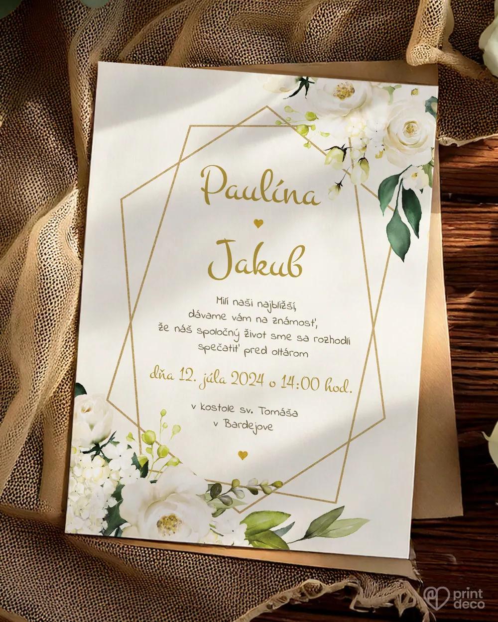 Originálna svadobná magnetka s elegantným motívom bielych ruží, doplnená o zlatý geometrický rám, zaujme svojou štýlovou a čistou estetikou. Je to milá a praktická pamiatka na svadbu, ktorú si hostia radi odnesú domov. Personalizovaná magnetka s menami a dátumom zaručí jedinečnosť každého kúsku. Vysoká kvalita spracovania a jemné detaily podčiarkujú luxusný dojem. Možno ju zladiť s ďalšími svadobnými tlačovinami rovnakého motívu pre dokonalý celok. Objednajte si ju ako nezabudnuteľný darček pre hostí.
