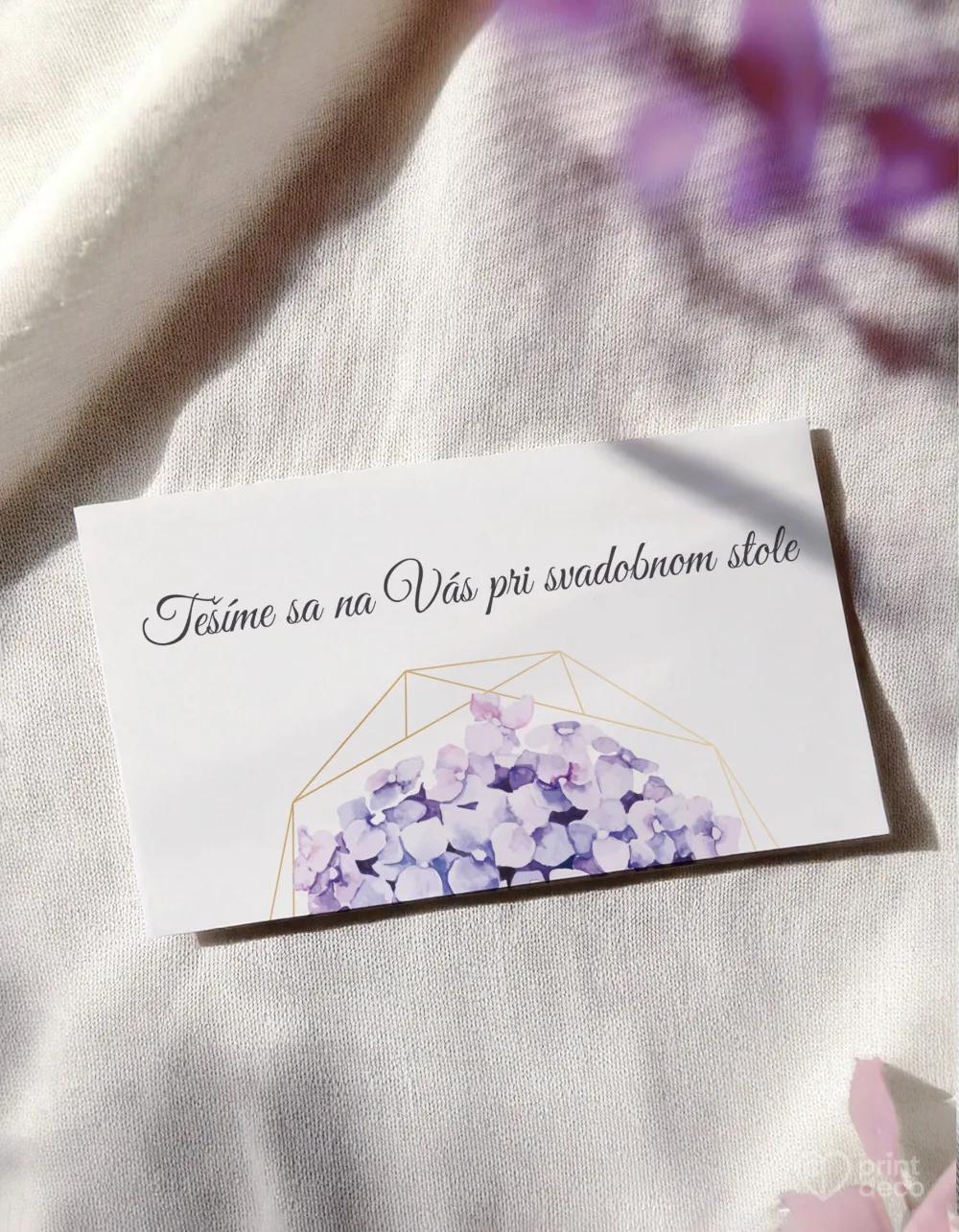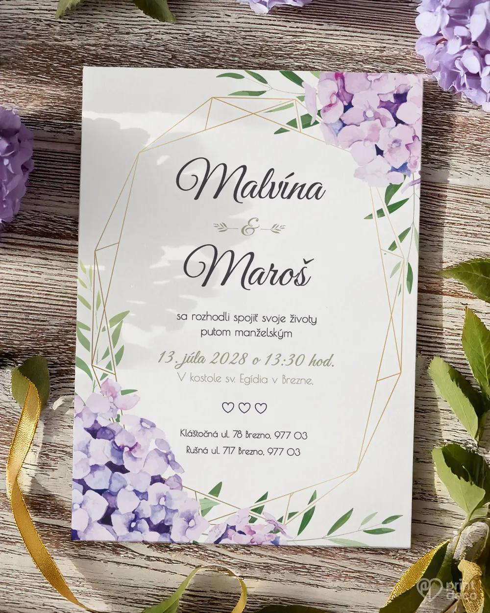 Štýlová svadobná magnetka s jemným kvetinovým motívom hortenzií a moderným geometrickým rámom v zlatej farbe poteší vašich hostí ako elegantná pamiatka na svadobný deň. Magnetka s personalizáciou – menami a dátumom svadby – bude ozdobou každej chladničky alebo kovovej tabule a vždy pripomenie krásne chvíle strávené s vami. Jemné fialovomodré hortenzie dodávajú dizajnu romantický a nadčasový nádych. Magnetky môžete ladiť s ďalšími tlačovinami v rovnakom štýle, ako sú menovky či etikety. Darujte hosťom milú spomienku, ktorá im ostane navždy.