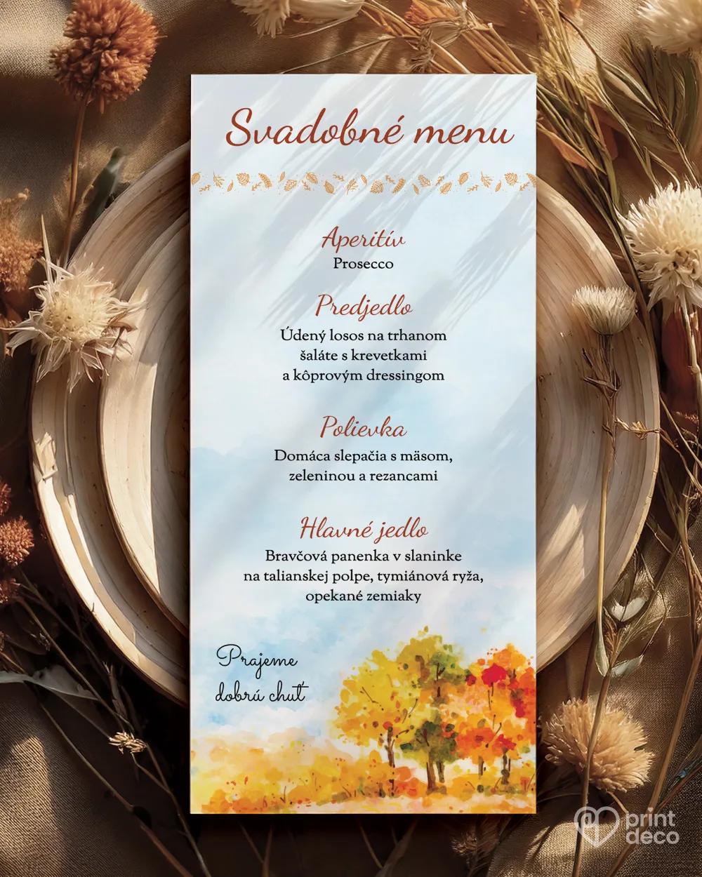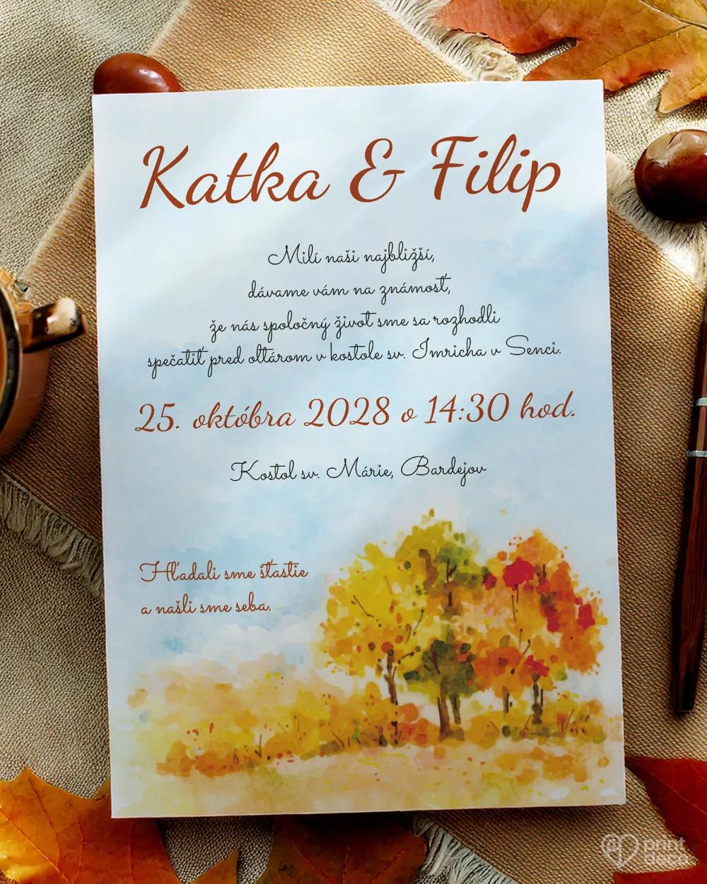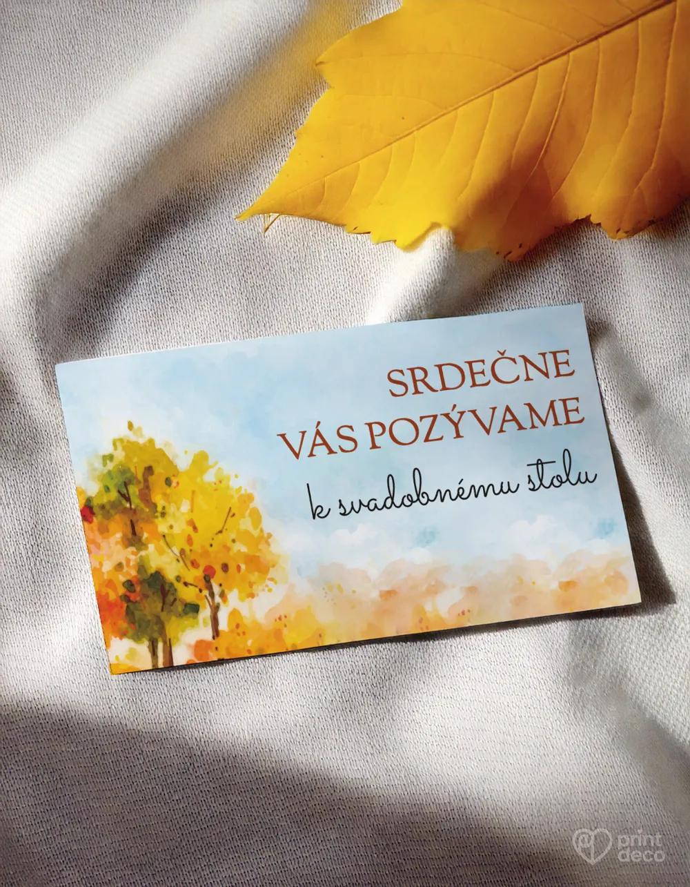 Štýlová svadobná magnetka s jemným jesenným motívom pestrofarebných stromov a lístkov prinesie vášmu svadobnému stolu hrejivú atmosféru. Je krásnou pamiatkou na svadbu a originálnym darčekom pre hostí, ktorí si ju uchovajú ako milú spomienku na váš výnimočný deň. Vďaka možnosti personalizácie textu podľa vašich predstáv bude magnetka jedinečná a dokonale prispôsobená vašej výzdobe. Jesenný dizajn s listami a teplými farbami harmonicky ladí s rustikálnymi aj elegantnými svadbami. Magnetku môžete zladiť aj s menovkami, etiketami, samolepkami či menu v rovnakom motíve. Objednajte si ich ešte dnes.