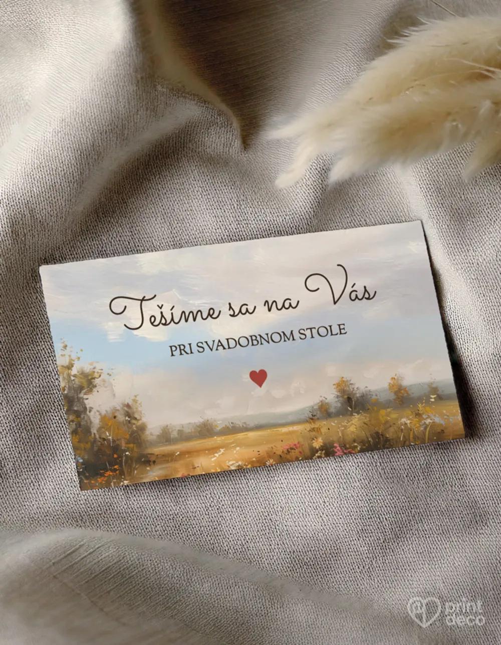 Romantická svadobná magnetka s maľovanou lúkou plnou kvetov a jemným nebom ako nezabudnuteľná pamiatka pre vašich svadobných hostí.