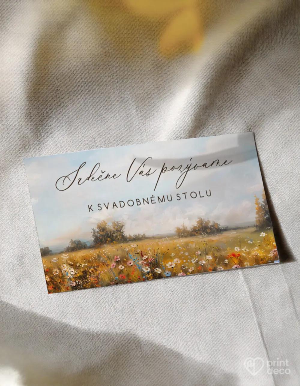 Svadobná magnetka s romantickou lúkou a pastelovým nebom ako krásna spomienka pre hostí na váš svadobný deň plný lásky a radosti.