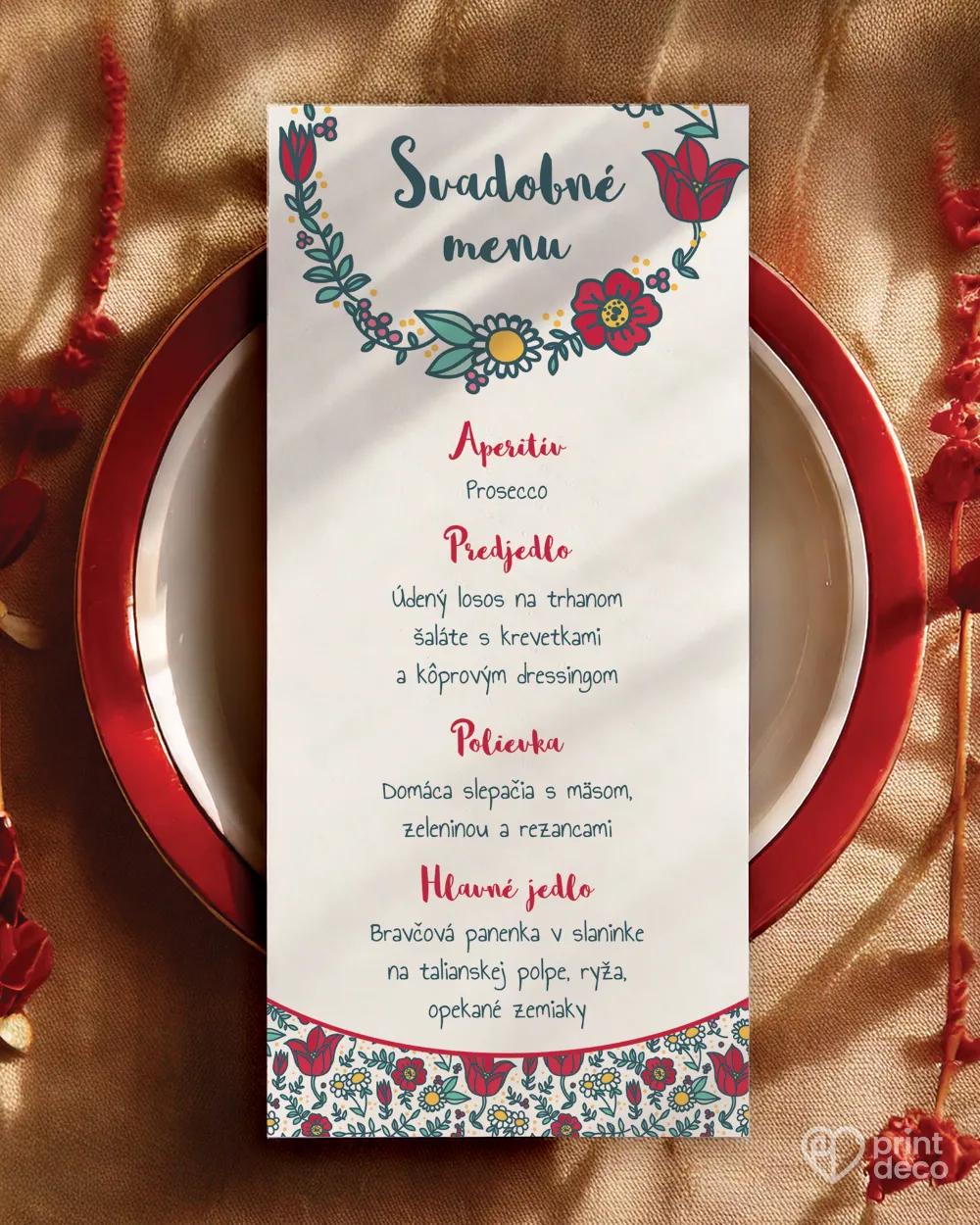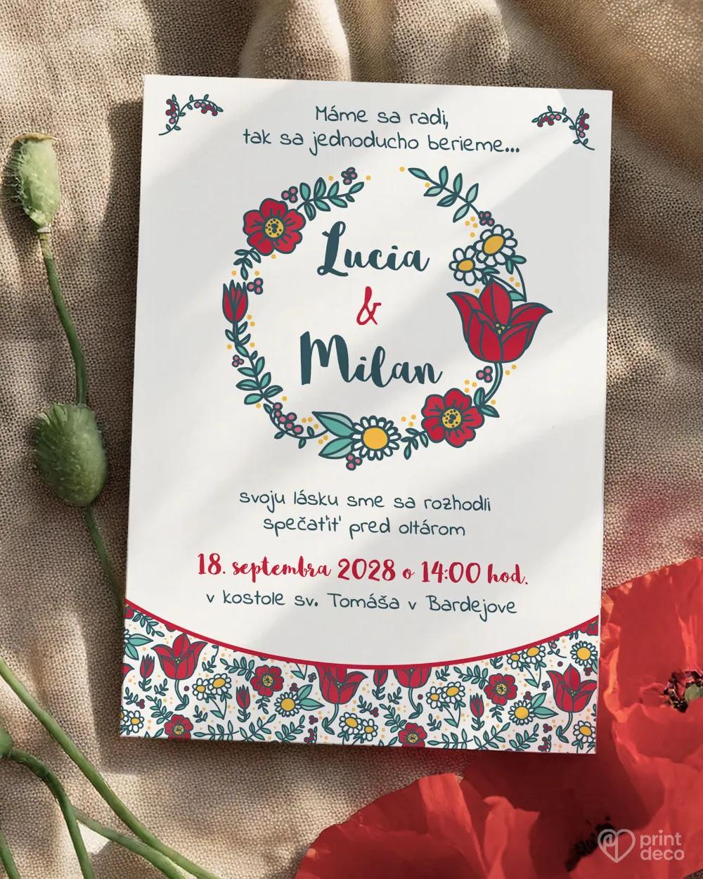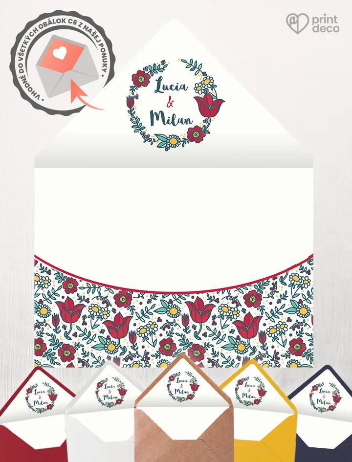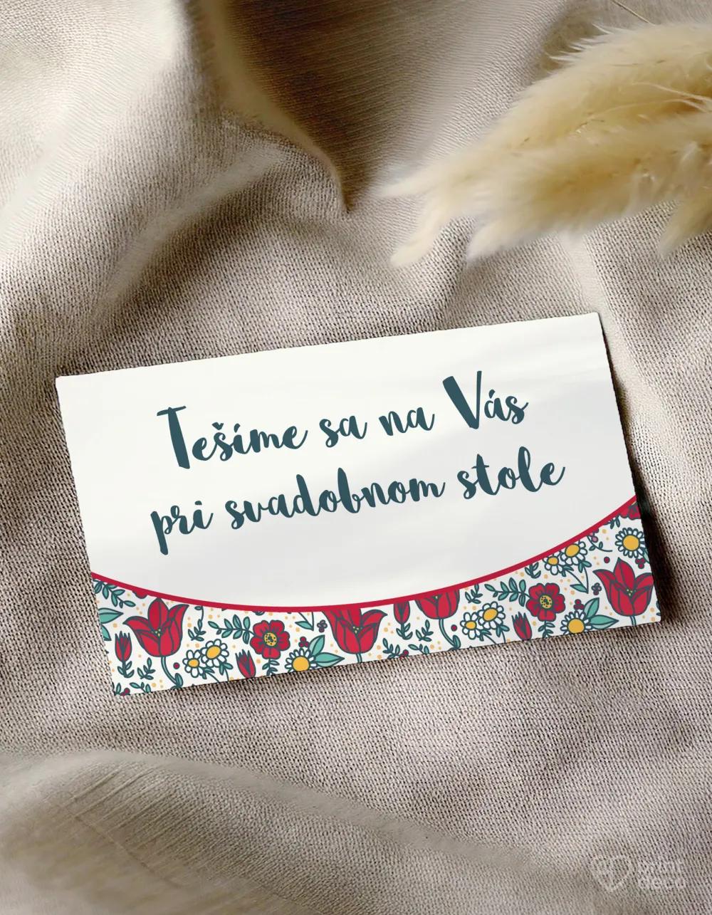 Ľudovo ladená svadobná magnetka s veselým kvetinovým motívom v červenom a zelenom poteší každého svadobného hosťa. Personalizovaná menami a dátumom svadby sa stane originálnym a praktickým darčekom, ktorý si hostia radi ponechajú ako spomienku na váš veľký deň. Žiarivé farby a folklórne vzory sa hodia k tradičnej i moderne poňatej svadbe a môžete ich ľahko zladiť s ďalšími tlačovinami rovnakého motívu. Poďakujte sa hosťom štýlovo a s folklórnym nádychom!
