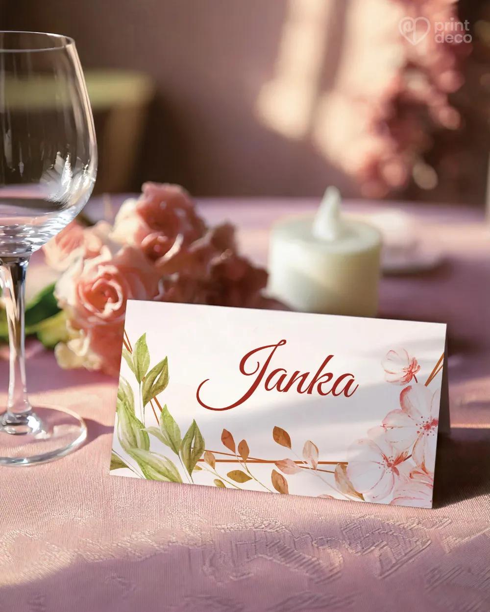 Svadobná magnetka s romantickým motívom ružových kvetov a zelených lístkov ako originálny darček pre hostí a milá pamiatka na váš výnimočný svadobný deň.