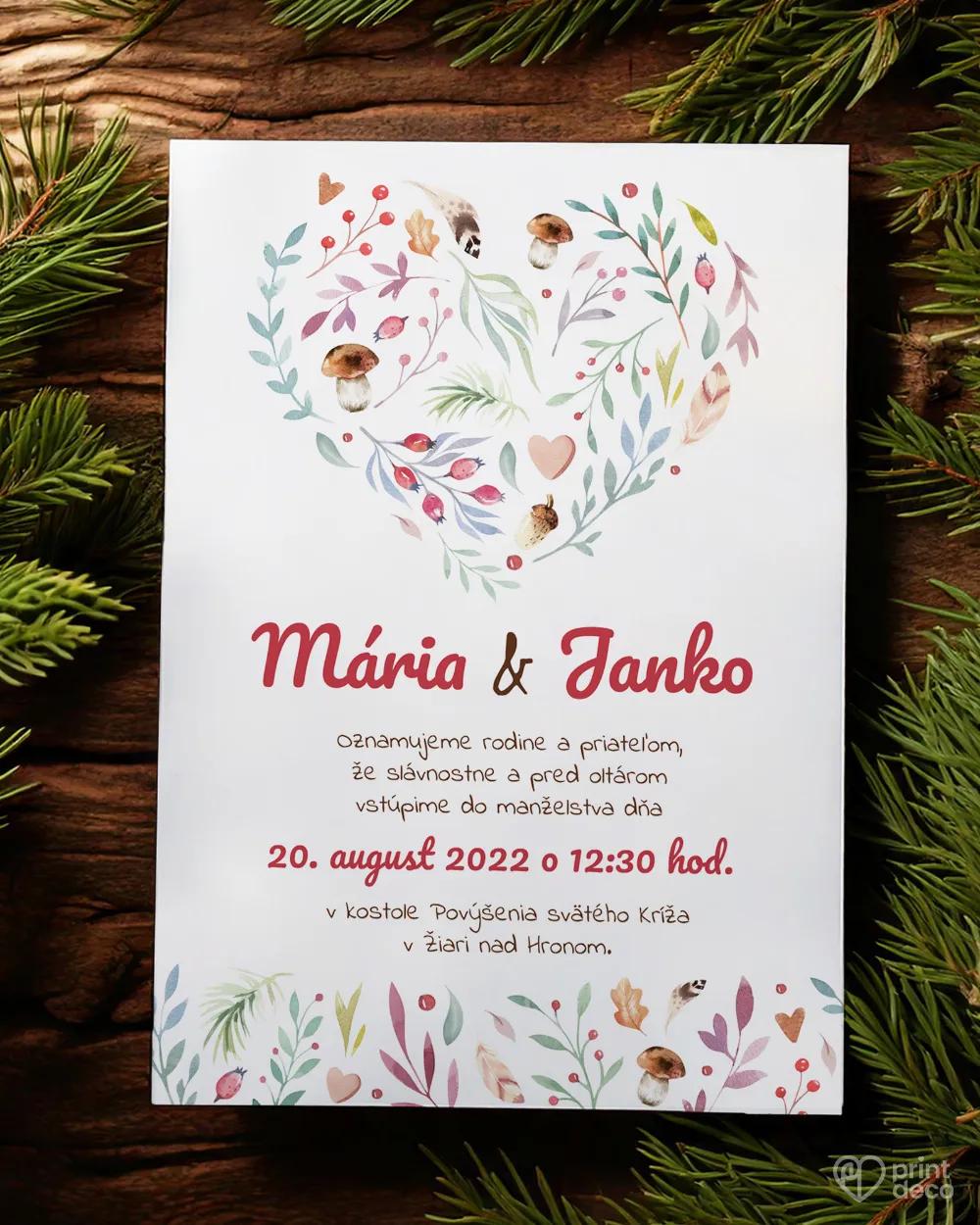 Pamätná svadobná magnetka s veselým motívom farebných lesných plodov, lístkov a húb ako originálna spomienka pre hostí na váš výnimočný svadobný deň.