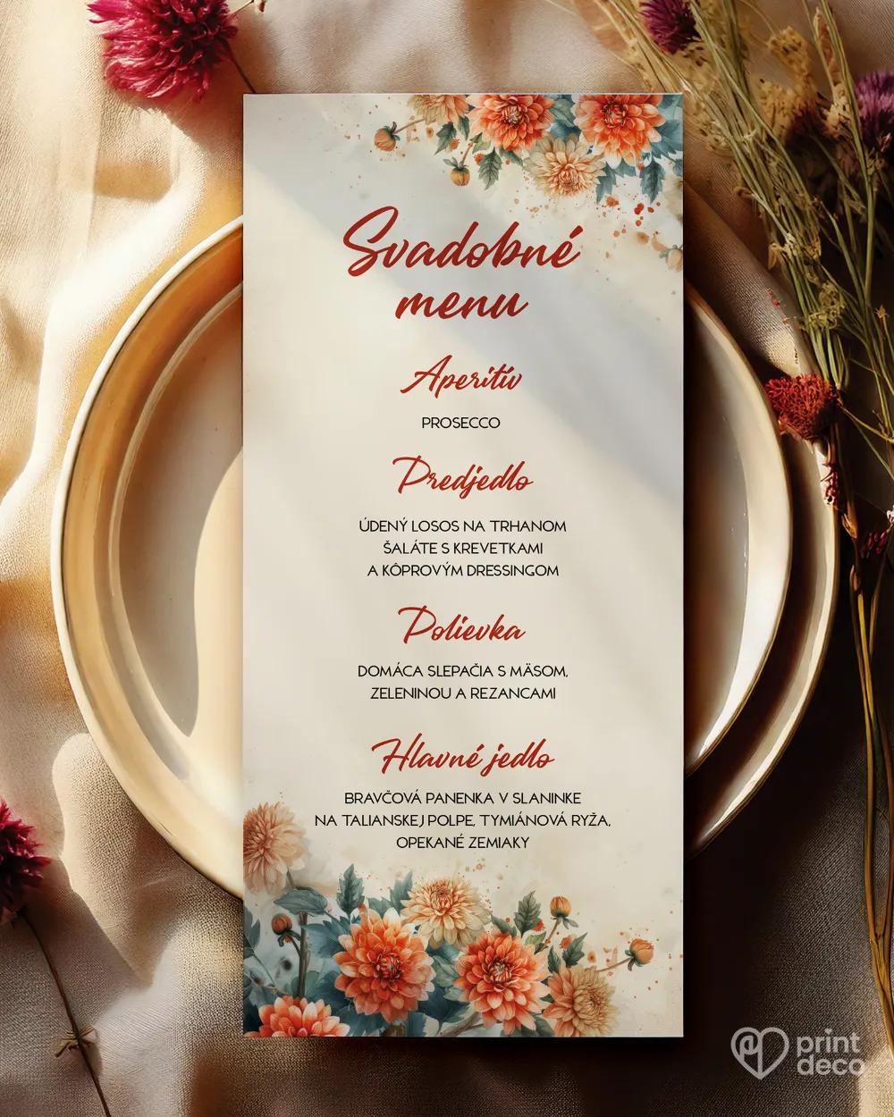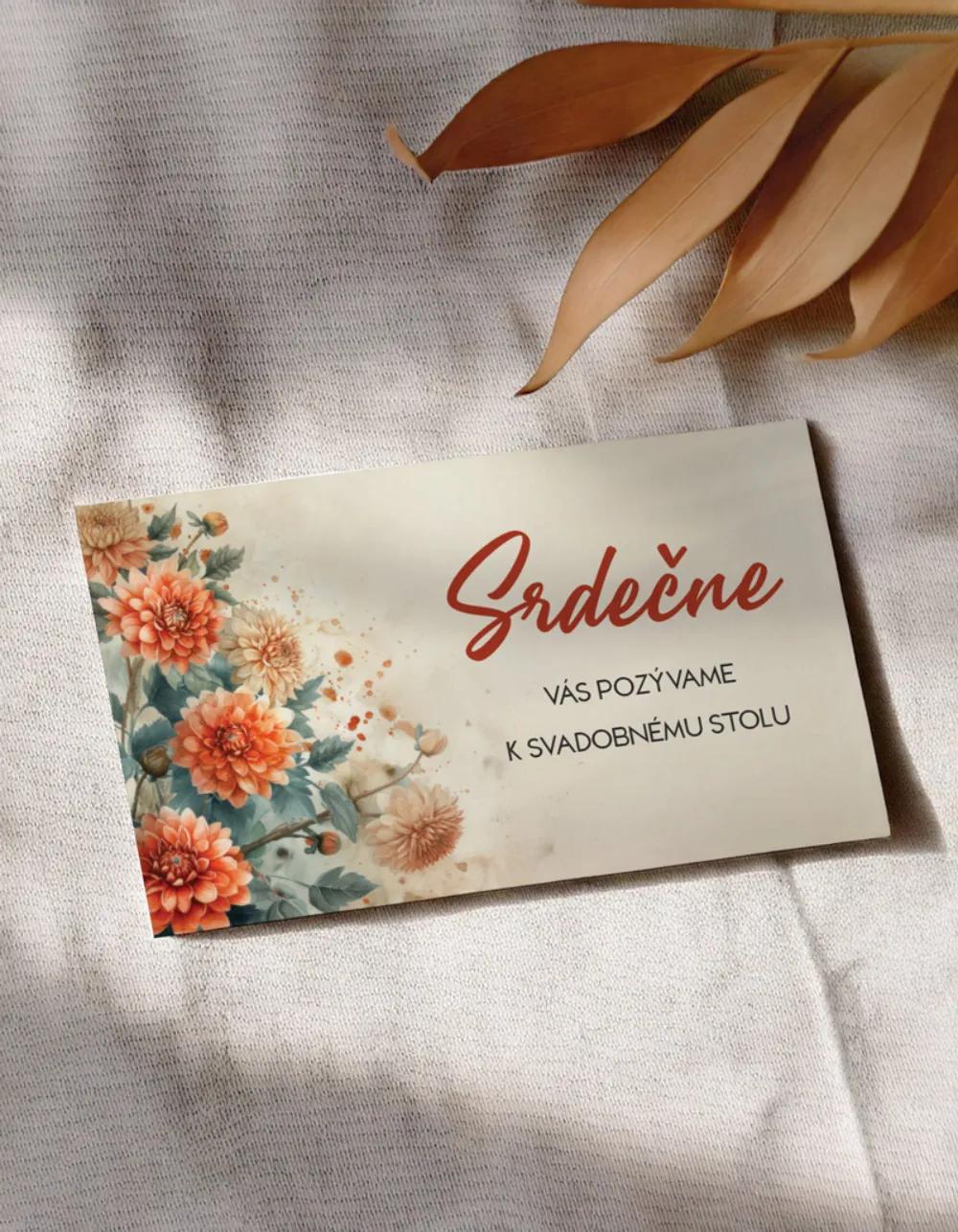 Originálna svadobná magnetka s motívom georgín v teplých tónoch ako krásna pamätná magnetka na svadbu a milý darček pre hostí, ktorý im pripomenie váš veľký deň.