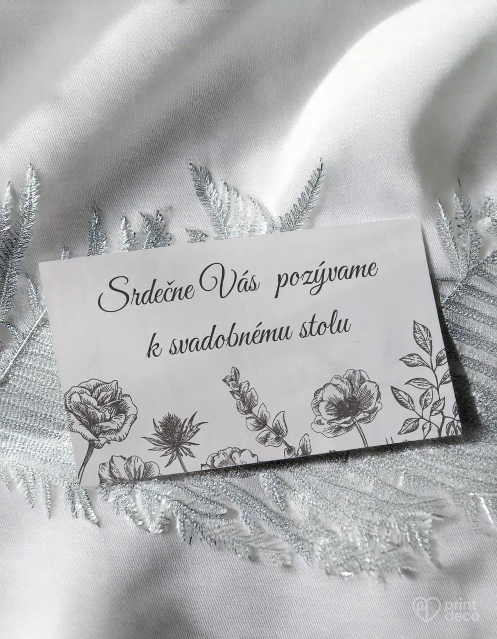 Minimalistická svadobná magnetka s motívom svetlých poľných kvetov v sivej farbe, originálna a praktická pamiatka pre hostí zo svadby.