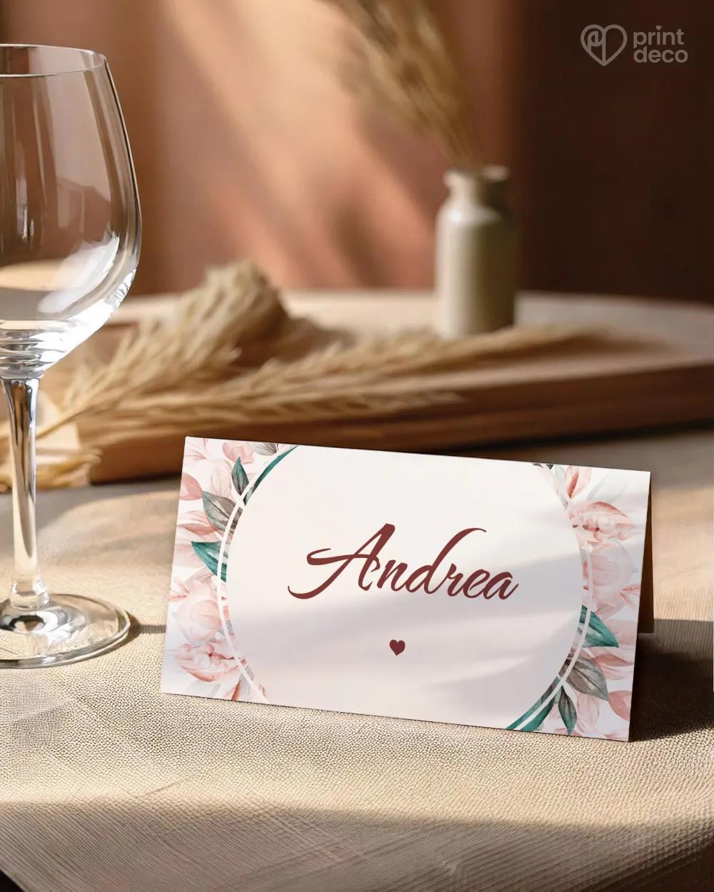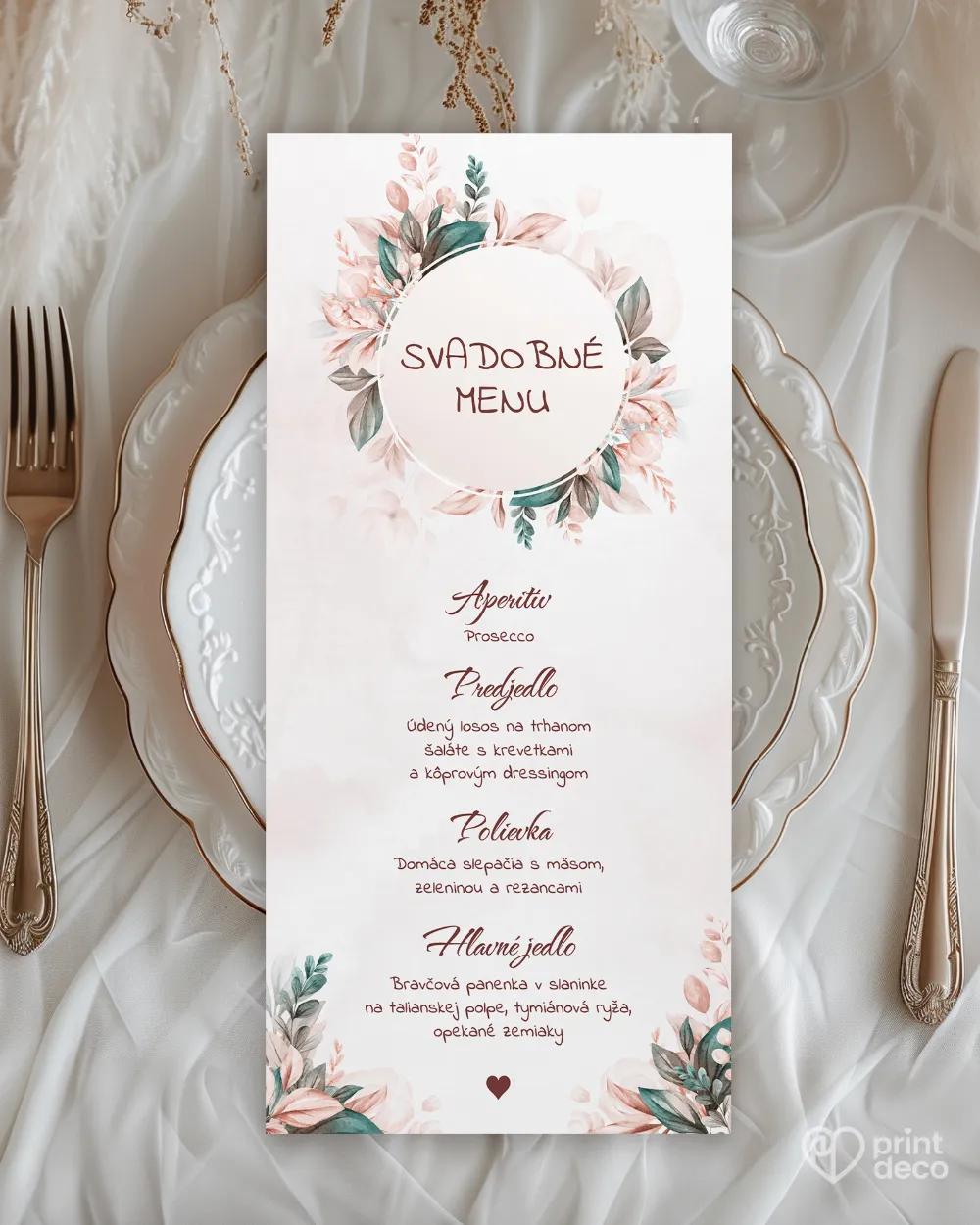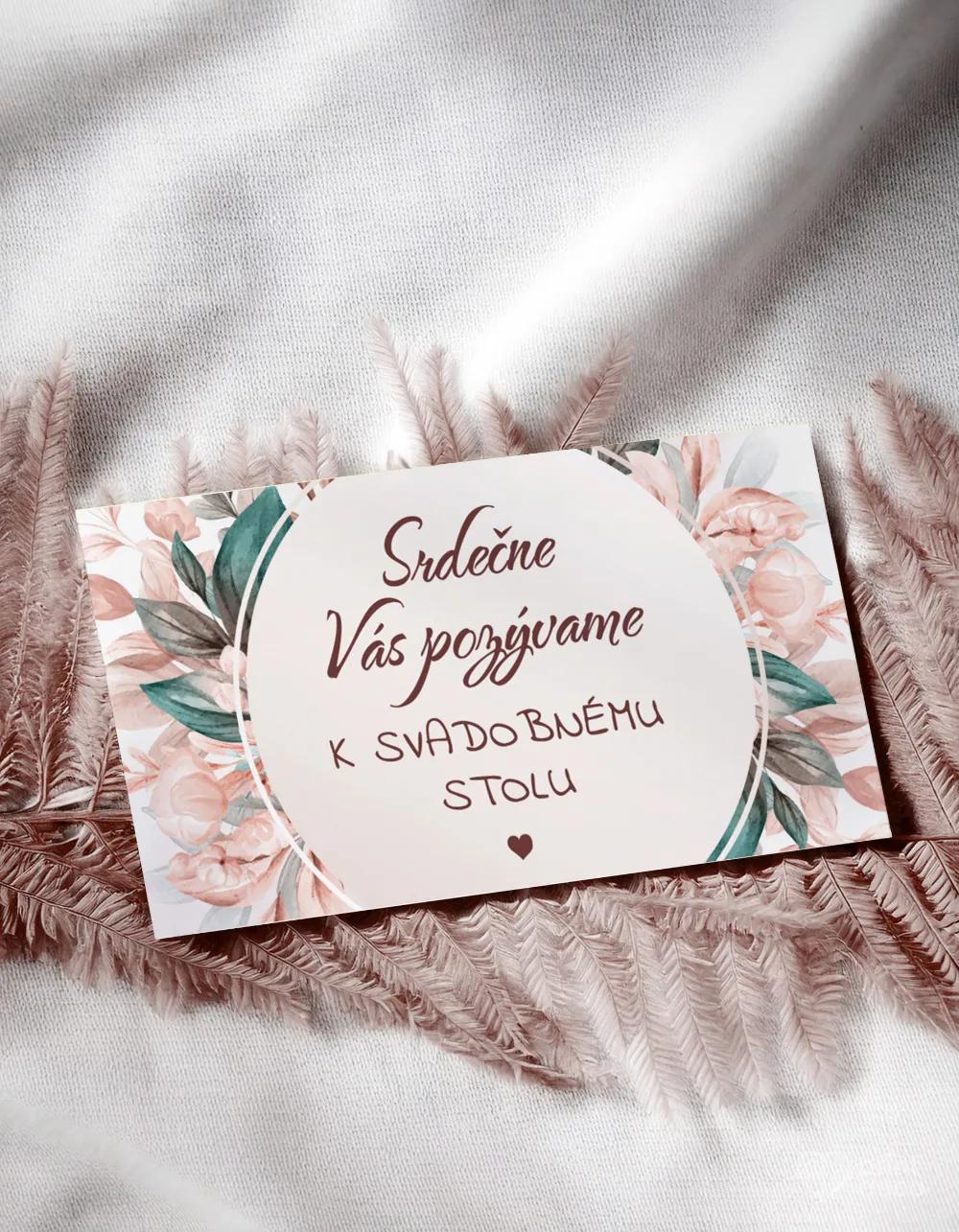 Svadobné oznámenie Botanic 01 s ružovými kvetmi a zelenými listami v kruhu mien. Jemný botanic dizajn pre romantickú svadbu.