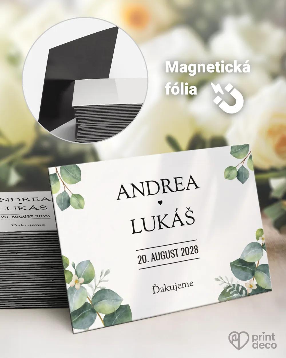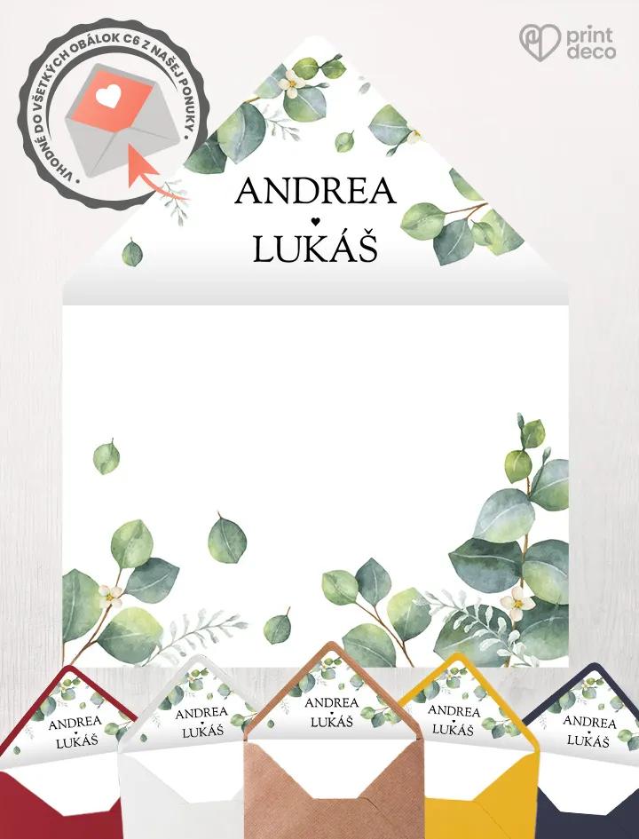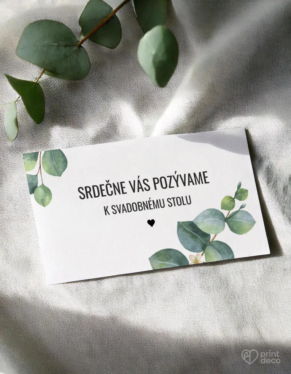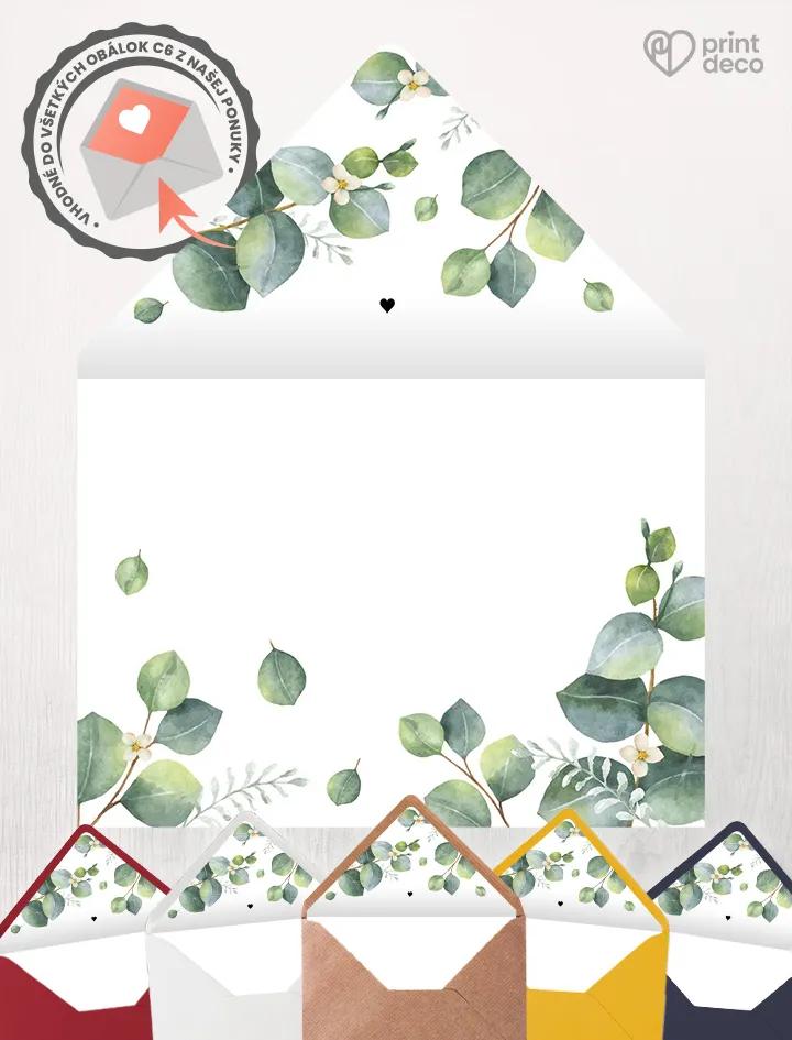 Ak sa Vaša svadba bude niesť v bielej farbe a prírodných motívoch, toto oznámenie je tu práve pre Vás. Stále viac a viac obľúbený eukalyptus veľmi jemne a vkusne dopĺňa oznámenie o Vašom veľkom dni. Svadobnú výzdobu tak môžete tiež doplniť eukalyptom, napríklad aj v nevestinej kytici, a spolu s ďalšími tlačovinami s rovnakým motívom z našej ponuky dosiahnete veľmi vkusný, romanticky pôsobiaci a harmonický celok.