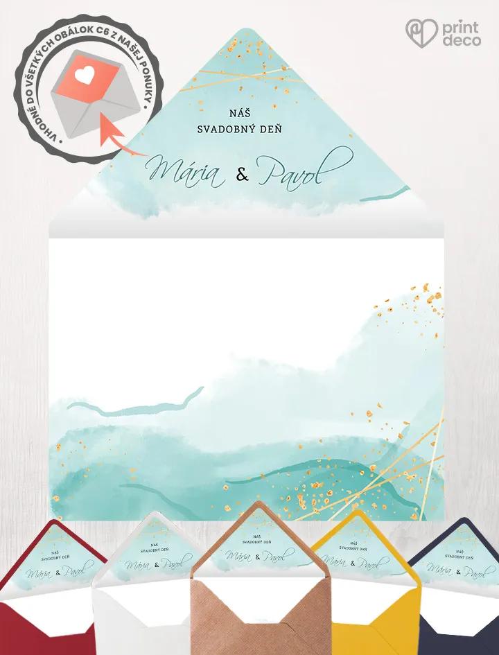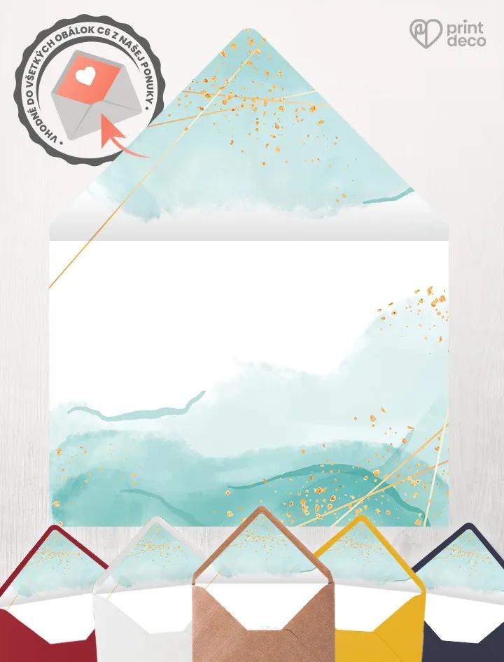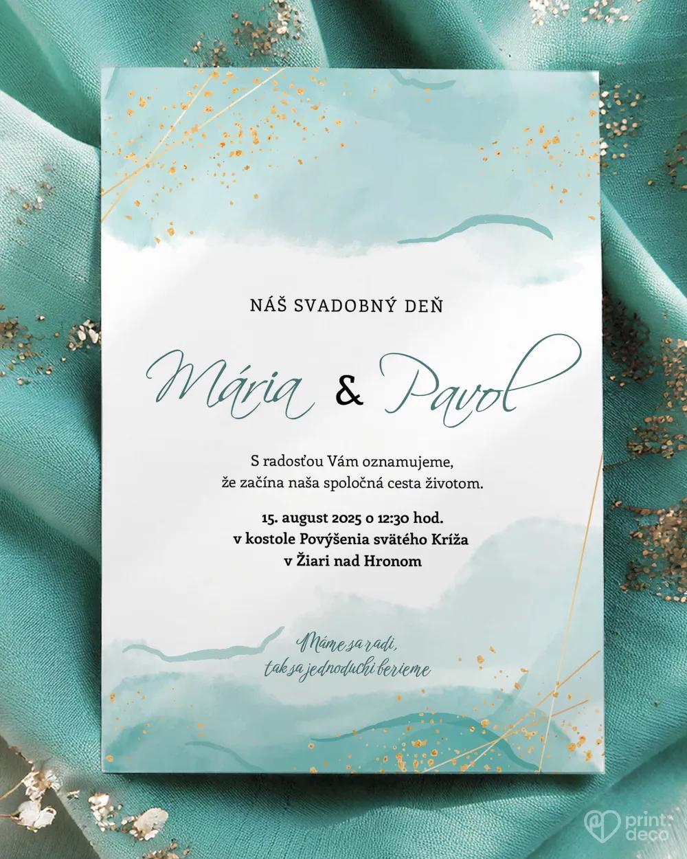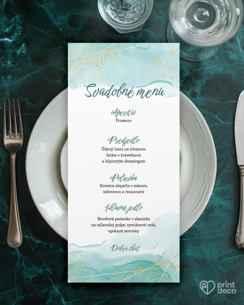 Svadobná pozvánka k stolu s abstraktným tyrkysovým motívom a zlatými detailmi. Úprava zdarma, expresná tlač, najvyššia kvalita.