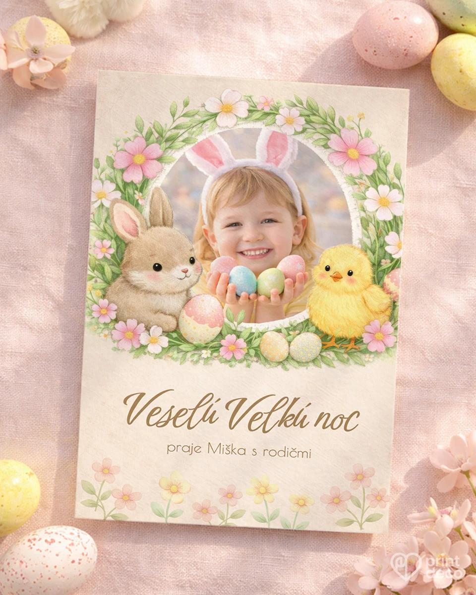 Veľkonočná foto magnetka s jemným kvetinovým motívom, zajačikom a kuriatkom a priestorom pre vlastnú fotografiu vytvorí milú rodinnú spomienku na sviatky. Úprava zdarma cez online editor, kvalitná