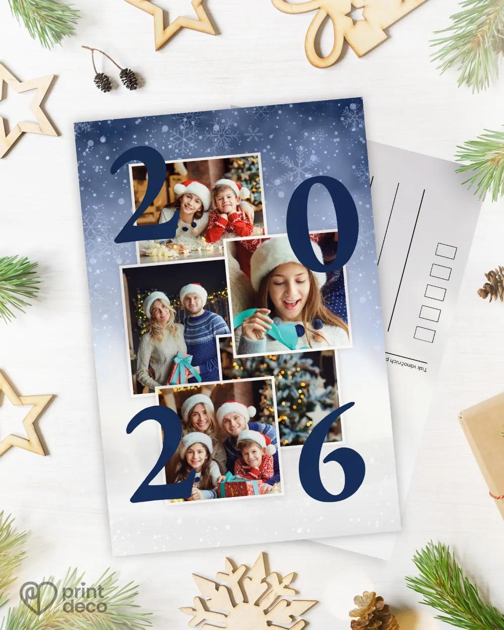 Veselá vianočná foto pohľadnica s viacerými okienkami na vaše obľúbené rodinné momenty pôsobí hrejivo a optimisticky. Vložte vlastné fotografie, upravte zdarma cez online editor a objednajte expres