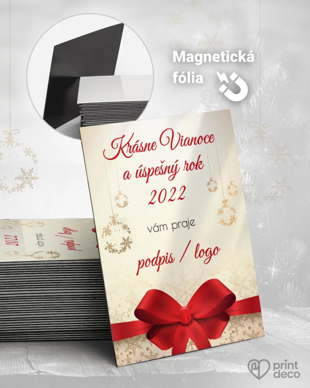 Elegantný vianočný pozdrav so zlatým podkladom a červenou mašľou pôsobí slávnostne a reprezentatívne. Ideálny pre rodiny aj firmy. Úprava zdarma cez online editor a expresná výroba.