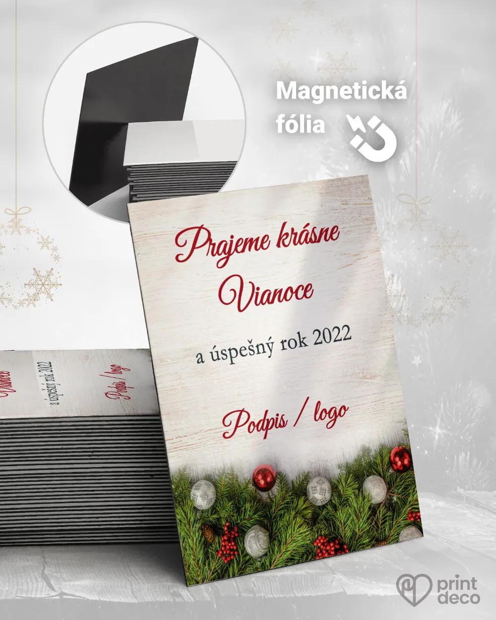 Tento vianočný pozdrav s čarom zimného ihličia, doplnený o červené a strieborné ozdoby, vyniká svojou prírodnou jednoduchosťou a elegantným vzhľadom. Jemné drevené pozadie vytvára teplú sviatočnú atmosféru, ktorá pôsobí príjemne a reprezentatívne zároveň. Ideálny pre rodiny, firmy a obchodných partnerov. Text, logo aj podpis je možné prispôsobiť – úprava zdarma cez online editor. Kvalitná tlač a expresná výroba zaručia dokonalý výsledok a sviatočný dojem.
