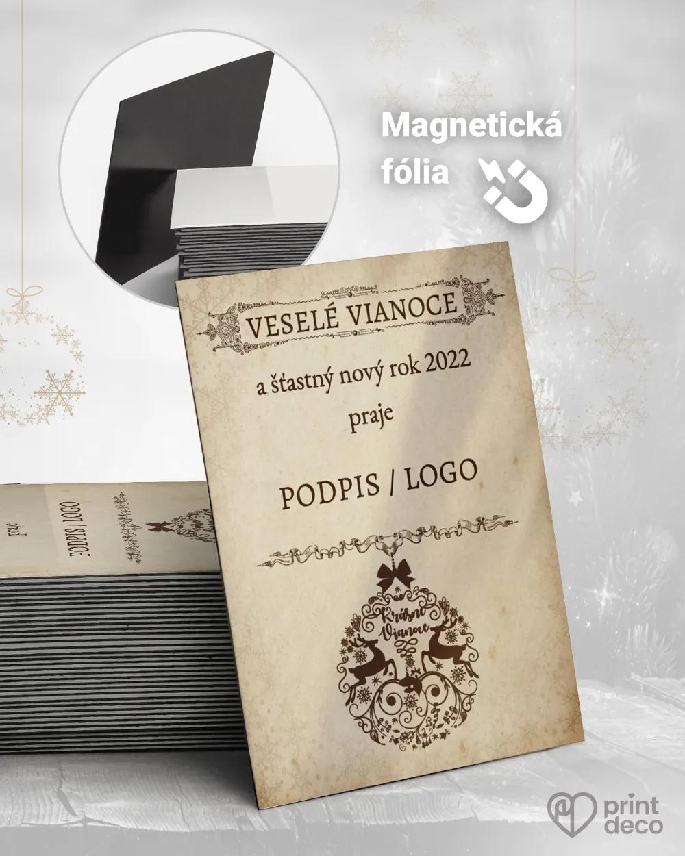 Obojstranný vianočný pozdrav vo vintage štýle s motívom sobov a ozdobnej gule. Ideálny pre firmy i milovníkov klasiky. Kvalitná tlač, expresná výroba a úprava zdarma cez online editor.
