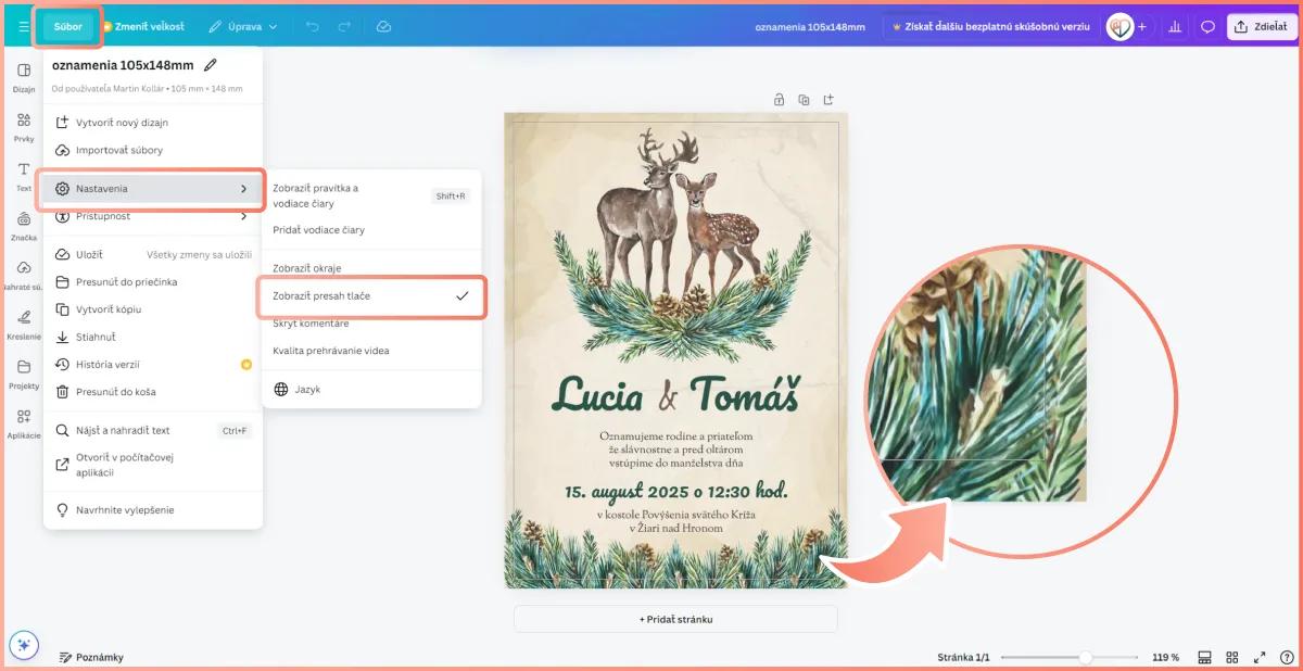 Pred uložením PDF prosím skontrolovať nastavenie presahu podľa obrázku cez Súbor – Nastavenia – Zobraziť presah tlače